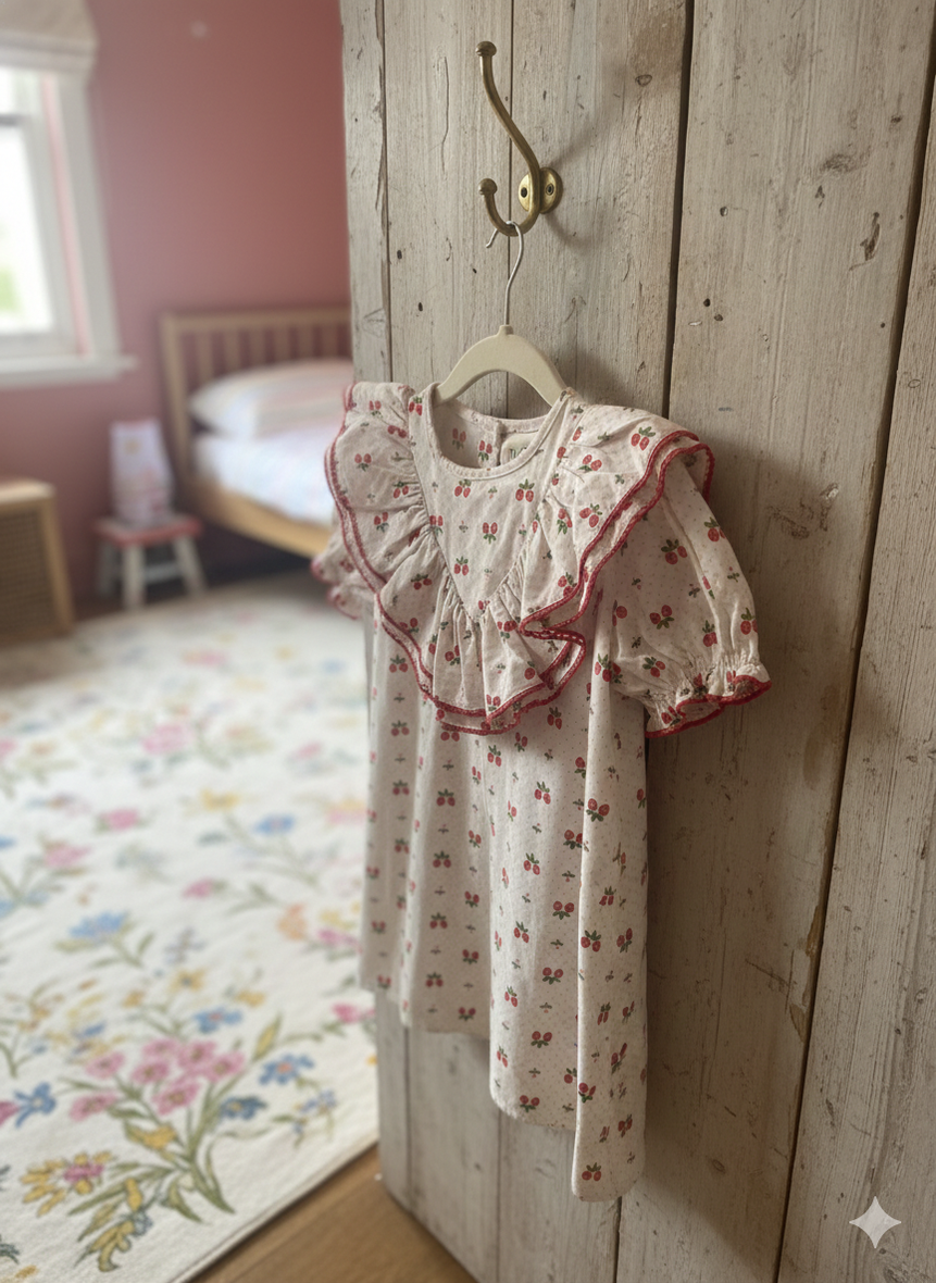 Estampa delicada de pequenos morangos, gola ampla com babados e acabamento em renda vermelha — detalhes que guardam o tempo com doçura.